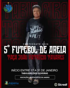 21/01/26 – O Bairro Tabuleiro dos Oliveiras dá início, neste sábado (24/01), ao 5º Campeonato de Futebol de Areia – Taça João Patrício Tavares, fortalecendo o esporte comunitário e a integração entre os moradores. A competição é organizada pela associação do bairro, com apoio da Prefeitura de Itapema, por meio da Secretaria de Esporte.