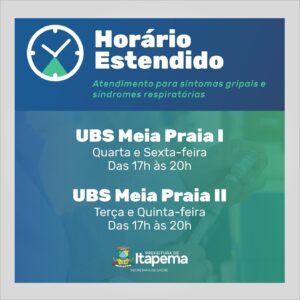 ➡️ ATENDIMENTO SINTOMAS GRIPAIS: A UBS Meia Praia I atenderá das 17h às 20h nesta quarta e sexta-feira. Já a UBS Meia Praia II atenderá das 17h às 20h nesta terça e quinta-feira.