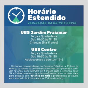 A Secretaria de Saúde realiza durante esta semana o horário estendido para vacinação contra o coronavírus e a gripe e também para atendimento de sintomas gripais e síndromes respiratórias