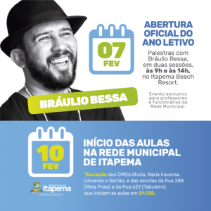 A Secretaria de Educação de Itapema realiza na próxima segunda-feira (07/02) a abertura oficial do ano letivo de 2022 com o tradicional evento destinado aos professores e funcionários da Rede Municipal de Ensino. Este ano a palestra será com o poeta Bráulio Bessa, conhecido pelos livros, vídeos em seu canal na internet e a participação semanal no programa Encontro da TV Globo.