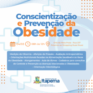 28/02/23 – A Secretaria de Saúde em parceria com a Secretaria de Esportes vai realizar uma ação de conscientização e prevenção da obesidade acontece neste sábado (04/03). A programação acontece na Orla da Meia Praia, na altura da Rua 237, das 8h às 12h.