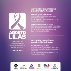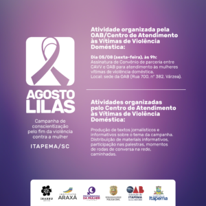 O mês de Agosto é marcado pelas atividades do chamado “Agosto Lilás” que tem como objetivo conscientizar a sociedade sobre o fim da violência doméstica contra a mulher. Em Itapema as ações serão desenvolvidas envolvendo o Governo Municipal, Legislativo, Judiciário, Polícia Civil, além de entidades e associações. Confira a programação: