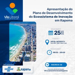 23/05/23 – Nesta quinta-feira (25/05) acontece a entrega e apresentação do Plano de Desenvolvimento do Ecossistema de Inovação (ELI) de Itapema. A ação, mobilizada pelo Sebrae SC em conjunto com a Secretaria de Turismo e Desenvolvimento Econômico, é direcionada a empreendedores, representantes de instituições de ensino, do Poder Público e entidades empresariais. Será no Hotel Intercity Itapema (Rua 256, nº 1035, Bairro Meia Praia), das 18h30 às 20h30.