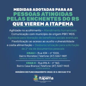 13/05/24 – A Prefeitura de Itapema, por meio da Secretaria de Assistência Social e de Lazer definiu medidas para o atendimento de pessoas atingidas pelas enchentes do Rio Grande do Sul que estão vindo para Itapema.