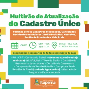 02/05/23 – A Secretaria de Assistência Social e de Lazer inicia neste final de semana um cronograma de mutirões de atualizações do Cadastro Único. O primeiro mutirão será neste sábado (06/05) destinada às famílias que tiveram o benefício bloqueado ou cancelado residentes nos bairros Jardim Praiamar, Morretes, Sertão do Trombudo e Meia Praia. O atendimento será no Centro de Referência de Assistência Social (CRAS I), localizado na rua 434, nº 1000, no Bairro Morretes, das 8h às 12h e das 13h às 17h.