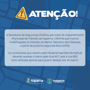 27/10/22 – A Secretaria de Segurança Pública, por meio do Departamento Municipal de Trânsito de Itapema, informa que haverá modificações no trânsito do Bairro Tabuleiro dos Oliveiras, a partir da próxima segunda-feira (31/10). Os condutores que vierem pela Marginal (sentido Norte/Sul) deverão acessar o bairro pela Rua 607, pois a rua 600 será utilizada apenas para quem desejar sair do bairro.
