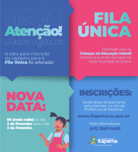 01/02/23 – A Secretaria de Educação informa que, devido a uma falha no sistema, a abertura do cadastro no Fila Única prevista para esta quarta-feira (01/02), será à 0h (meia noite) do dia 02 para o dia 03 de fevereiro. A inscrição acontece somente pela internet, diretamente no site da Prefeitura de Itapema (www.itapema.sc.gov.br) no Banner “Fila Única”.
