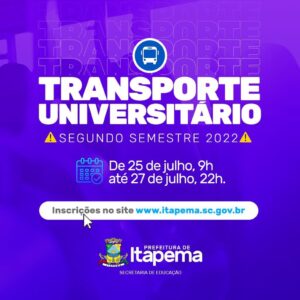 A Secretaria de Educação informa que o cadastro para o transporte universitário para o segundo semestre de 2022 inicia na próxima semana. As inscrições ocorrem via internet diretamente no site da Prefeitura de Itapema (www.itapema.sc.gov.br) de 25 de julho de 2022, a partir das 9h até 27 de julho de 2022 até às 22h. De acordo com a Lei Nº 3653, de 11 de Julho de 2017, serão disponibilizadas anualmente 600 vagas para universitário, distribuídas nos períodos matutino, vespertino e noturno. O edital completo também está disponível no site no link Serviços – Cidadão – Edital de Chamamento Transporte Universitário. Mais informações no telefone (47) 3267-1400.