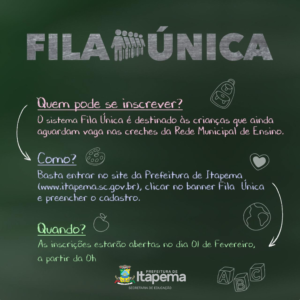 A Secretaria de Educação informa que a abertura do cadastro do Fila Única será às 00h (meia noite) do dia 31 para o dia 01 de fevereiro. Os pais deverão entrar no site da Prefeitura de Itapema (www.itapema.sc.gov.br) e clicar no banner “Fila Única”.