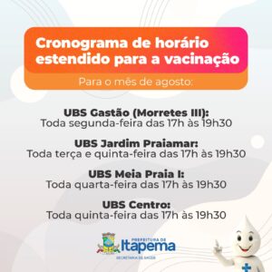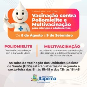 08/08/22 – A Secretaria de Saúde iniciou nesta segunda-feira (08/08) a Campanha Nacional de Vacinação contra a Poliomielite e Multivacinação para crianças e adolescentes menores de 15 anos. As Unidades Básicas de Saúde (UBS) estarão abertas normalmente de segunda a sexta-feira das 8h às 12h e das 13h às 17h, além dos horários estendidos.