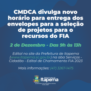 30/11/22 – O Conselho Municipal dos Direitos da Criança e Adolescente (CMDCA) informa que, por conta do Decreto 084/2022 que dispõe sobre o horário de atendimento em dias de jogos da Seleção Brasileira na Copa do Mundo, o horário para entrega dos envelopes das entidades que desejam participar da seleção do FIA 2023 foi alterado. Os interessados devem entregar as propostas no dia 2 de dezembro de 2022, das 9h às 13h na sala da Comissão de Seleção na Secretaria de Assistência Social, localizada na Rua 120, nº 385, no Bairro Centro. Mais informações pelo telefone (47) 3267-1475.