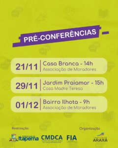 18/11/22 – As pré-Conferências Municipais dos Direitos da Criança e Adolescente vão começaram em Itapema. Os encontros preparatórios para etapa municipal iniciam na próxima semana. Ao todo serão três encontros: Bairro Casa Branca (21/11), Bairro Jardim Praiamar (29/11) e Bairro Ilhota (01/12).