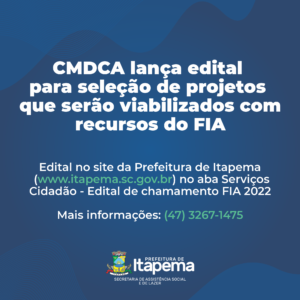 01/11/22 – O Conselho Municipal dos Direitos da Criança e Adolescente (CMDCA) lançou o edital de chamamento público para a seleção de organização da sociedade civil interessada em celebrar termo de colaboração que tenha por objeto a execução de atividades ligadas à criança e adolescente conforme planos de trabalho. Este ano, o valor destinado do Fundo da Infância e Adolescência (FIA) será de R$ 1 milhão e 400 mil. O edital e seus anexos poderão ser baixados pelo site da Prefeitura de Itapema (www.itapema.sc.gov.br) na aba Serviços – Cidadão – Edital de chamamento FIA 2022. Já a entrega dos envelopes será no dia 2 de dezembro de 2022, das 9h às 11h e das 14h às 16h, para Comissão de Seleção na Secretaria de Assistência Social, localizada na Rua 120, nº 385, no Bairro Centro. Mais informações pelo telefone (47) 3267-1475.