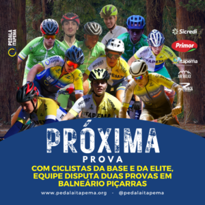 No sábado (4), a equipe itapemense estará representada na prova de Cross Country Olímpico (XCO) por sete ciclistas das categorias de base: Augusto Sauer, Lucas Alexandre, Kauã Medeiros, Lucas Cavalcante, Pablo Souza, Samuel Gonçalves e Maria Bedin, além de Vitória Gohr e Nathalia Cubilla na categoria Elite.