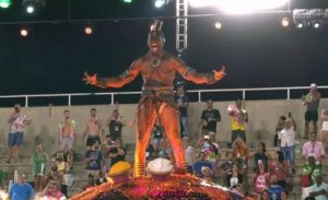 Logo na comissão de frente, o ator Demerson D’alvaro se destacou com a personificação de Exu, escalando um imenso globo e chegando ao “topo do mundo”, onde se banqueteou com seu padê — as oferendas.