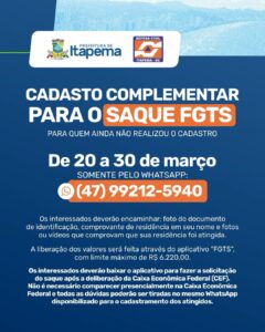 19/03/25 – A Defesa Civil de Itapema informa que abriu um novo prazo de cadastro para os moradores atingidos pelas fortes chuvas em janeiro de 2025. O prazo será de 20/03 a 30/03 somente pelo WhatsApp (47) 99212-5940. A medida é destinada apenas as famílias que realizaram o cadastro no mês de fevereiro e faz parte das etapas para a solicitação do saque do FGTS.