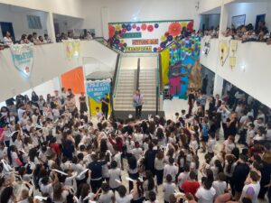 11/10/23 – A quarta-feira (11/10) foi dia de música na ECIM Maria Linhares de Souza, no Bairro Alto São Bento. O artista Nego Joe colocou os alunos para cantar com o projeto Paz nas Escolas. A iniciativa tem como objetivo levar música, poesia e entretenimento, incentivando a paz nos estudantes. O projeto tem apoio do Sicredi e nesta edição deve passar por escolas de vários municípios da região.