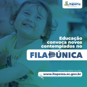 12/05/23 – A Secretaria de Educação publicou nesta sexta-feira (12/05) um novo chamamento da Fila Única. O edital 004-2023 está disponível no site da Prefeitura de Itapema (www.itapema.sc.gov.br) no banner “Fila Única”. Os pais das crianças convocadas devem comparecer na Secretaria de Educação, localizada na Av. João Francisco Pio, 482, no Bairro Canto da Praia, para buscar o encaminhamento de matrícula nos dias de 15 a 17 de março, com certidão de nascimento e documento de identificação, das 13h às 17h. Nos casos das crianças com deficiência será necessário apresentar também o laudo médico. As convocações obedecem a data de inscrição, as unidades escolares e as vagas disponíveis.