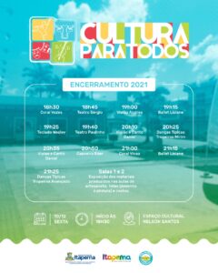 A Secretaria de Turismo, Cultura, Esporte e Desenvolvimento Econômico, realiza nesta sexta-feira (10/12) o encerramento das oficinas culturais e do Cultura para Todos. O evento será no Espaço Cultural (antigo Mercado Público), a partir das 18h30. Na programação terá exposição dos trabalhos e apresentações das aulas oferecidas gratuitamente à comunidade durante todo o ano.