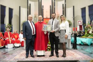 Chovia bastante na noite desta segunda-feira (06), mas a comunidade esteve presente na Igreja Matriz de Tijucas para a missa de encerramento da Festa do Divino Espírito Santo. O momento ganhou ainda mais destaque em virtude da formalização da Lei Municipal 2914/2022, que declara a festividade Patrimônio Histórico e Cultural. A entrega de uma placa simbólica foi feita pelo vereador Cláudio Eduardo de Souza, o Cláudio do Jornal (PDT), autor da proposição.