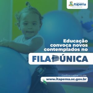 06/10/22 – A Secretaria de Educação publicou nesta quinta-feira (06/10) um novo chamamento da Fila Única. O edital 010-2022 está disponível no site da Prefeitura de Itapema (www.itapema.sc.gov.br) no banner “Fila Única”. Os pais das crianças convocadas devem comparecer na Secretaria de Educação, localizada na Av. João Francisco Pio, 482, no Bairro Canto da Praia, para buscar o encaminhamento de matrícula nos dias 06, 07 e 10 de outubro de 2022 das 13h às 17h, com certidão de nascimento e documento de identificação. As convocações obedecem a data de inscrição, as unidades escolares e as vagas disponíveis.