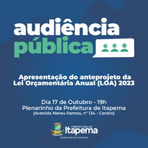 14/10/22 – A Prefeitura de Itapema, por meio da Secretaria de Finanças, realiza na próxima segunda-feira (17/10) a audiência pública com o objetivo de discutir e apresentar as propostas e do anteprojeto da Lei Orçamentária de 2023. A audiência será no Plenarinho da Prefeitura de Itapema, localizado na Avenida Nereu Ramos, nº 134, no Bairro Centro, a partir das 19h.
