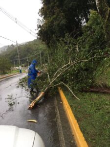 10/08/22 – O trabalho de atendimento as ocorrências causadas devido as chuvas e a passagem do ciclone em Itapema iniciou desde a madrugada e seguiu durante toda esta quarta-feira (10/08). Equipe da Defesa Civil monitoravam todos os pontos da cidade e a equipe da Secretaria de Obras atuava na limpeza, desobstrução de ruas e recolhimento de árvores e apoio a população.
