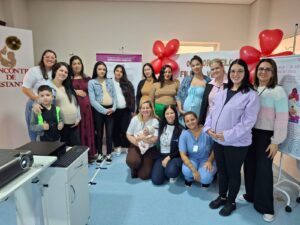 Cada participante recebeu ainda um kit de brindes com itens de cuidados para as mamas e para o coto umbilical dos bebês, reforçando a preparação para esse momento especial.