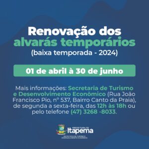 23/04/24 – A Secretaria de Turismo e Desenvolvimento Econômico informa que a renovação dos alvarás temporários para baixa temporada 2024 (inverno) iniciou no dia 01 de abril e segue até 30 de junho de 2024.