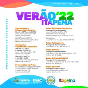 “Com o Verão Itapema 2022 vamos proporcionar entretenimento, orientações de educação ambiental e qualidade de vida aos moradores e turistas que estão visitando nossa cidade”, destacou o Secretário de Turismo, Cultura, Esporte e Desenvolvimento Econômico, Fabrício Lazzari.