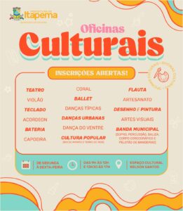 15/02/23 – A Secretaria de Cultura informa que as inscrições para as oficinas do Projeto “Cultura para Todos” já estão abertas. Os interessados devem ir até o Espaço Cultural (antigo Mercado Público), localizado na Rua 112, no Centro, de segunda a sexta-feira, das 9h às 12h e das 13h30 às 17h. Já as aulas devem acontecer no próprio Espaço Cultural, na Apae, na Escola Paulo Reis e na Associação de Moradores do Bairro Ilhota.