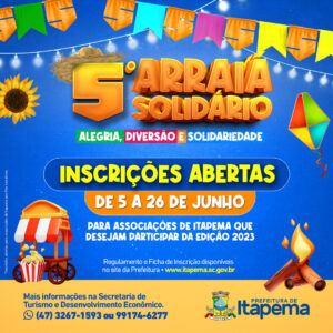 05/06/23 – A Secretaria de Turismo e Desenvolvimento Econômico abriu nesta segunda-feira (05/06) as inscrições para as associações que desejam participar do 5º Arraiá Solidário de Itapema. O evento acontecerá no dia 22 de julho, na Praça da Paz, a partir das 12h.