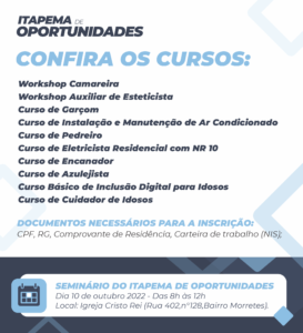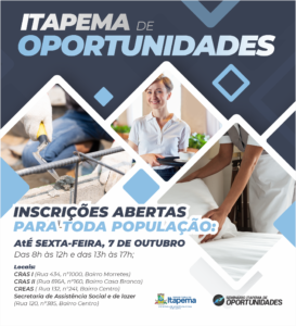 04/10/22 -A Secretaria de Assistência Social liberou as vagas remanescentes do Programa Itapema de Oportunidades para toda a população. Os interessados devem fazer a inscrição até sexta-feira (07/10) para comparecer no CRAS I (Rua 434, nº1000, Bairro Morretes), CRAS II ( Rua 816A, nº 160, Bairro Casa Branca), Secretaria (Rua 120, esquina com a Rua 132, Bairro Centro), das 8h às 12h e das 13h às 17h. Dentre os documentos necessários estão CPF, RG, Comprovante de Residência, Carteira de trabalho (NIS).