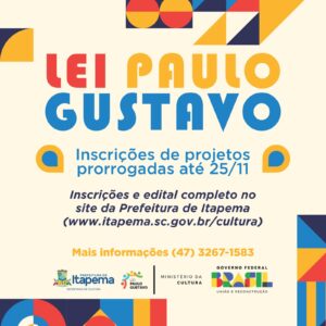 16/11/23 – A Secretaria de Cultura informa que as inscrições para a seleção de projetos da Lei Paulo Gustavo foram prorrogadas. Os interessados agora têm até o dia 25 de novembro para cadastrar os projetos culturais. O edital completo e o link das para inscrições estão disponíveis no site da Prefeitura de Itapema (www.itapema.sc.gov.br/cultura