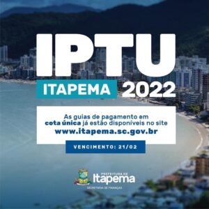 A cota única do Imposto Predial e Territorial Urbano (IPTU) 2022 segue disponível para pagamento em Itapema. O documento pode ser acessado pela internet no site da Prefeitura de Itapema (www.itapema.sc.gov.br), solicitado por e-mail (boleto.iptu@itapema.sc.gov.br