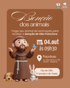 01/10/25 – A Paróquia Santo Antônio realiza neste sábado (04/10), a partir das 9h30, na Praça da Paz, a tradicional Bênção dos Animais, em homenagem ao Dia de São Francisco de Assis, reconhecido como padroeiro da ecologia e protetor dos animais.