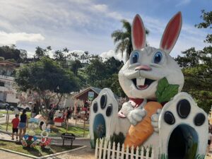 Nova Trento, 13.04.2022 – Ele é a maior atração da La Terza Pasqualina, evento de Páscoa realizado até o próximo domingo, dia 17, em Nova Trento, no Vale do Rio Tijucas. Sim, maior mesmo! O Coelho Gigante tem 7,15 metros de altura e é feito de estrutura metálica e fibra de vidro e chama a atenção de quem passa pela Praça Getúlio Vargas, no centro da cidade. Não há quem resista a uma foto.