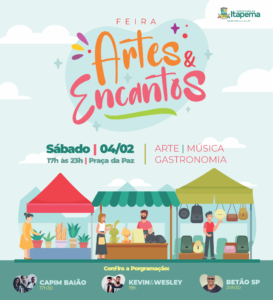 01-02-23 – Neste sábado (04/02) tem mais uma edição da Feira Artes & Encantos na Praça da Paz, das 17h às 23h. O evento conta com muita música e expositores locais de diversos segmentos, como artesanato, plantas, gastronomia, produtos coloniais, esculturas e muito mais.