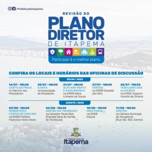 “Durante as oficinas, vamos apresentar os principais padrões urbanísticos vigentes, aspectos relevantes sobre o crescimento da Cidade; as propostas do Poder Executivo de alteração do Plano Diretor e suas Leis Complementares; e sugestões de obras estruturantes”, destacou o Presidente do Conselho da Cidade (ConCidade), Valdemiro Adauto de Souza