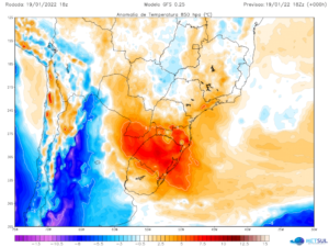 A MetSul Meteorologia alerta que a bolha de calor que está instalada sobre o Rio Grande do Sul há mais de uma semana deve se intensifica ainda mais nos próximos dias com uma escalada na temperatura que levará grande parte do Estado a ter máximas ao redor ou acima dos 40ºC no fim de semana.