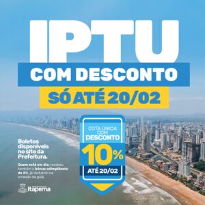 19/02/24 – A Prefeitura de Itapema, por meio da Secretaria de Finanças, informa que o prazo para pagamento do boleto em cota única do Imposto Predial e Territorial Urbano (IPTU) 2024 de Itapema encerra nesta terça-feira (20/02). O documento pode ser acessado pela internet no site da Prefeitura de Itapema (www.itapema.sc.gov.br), via WhatsApp (47) 3268-8031 ou retirado pessoalmente no Setor de IPTU no Paço Municipal, das 9h às 18h.