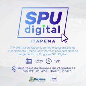 14/07/23 – A Prefeitura de Itapema, por meio da Secretaria de Planejamento Urbano, realiza na próxima segunda-feira (17/07) o lançamento do Programa SPU Digital. O evento será na no auditório da Câmara de Vereadores, localizado na Rua 120, nº 423 -Bairro Centro, a partir das 19h.