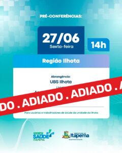 26/06/25 – A Secretaria Municipal de Saúde informa que, devido às condições climáticas, a Pré-Conferência da Saúde prevista para esta sexta-feira (27), na Região Ilhota, foi adiada.Uma nova data será divulgada em breve nos canais oficiais da Prefeitura de Itapema.