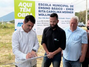 12/11/25 – A Prefeitura de Itapema assinou nesta quinta-feira (13/11) a ordem de serviço para a construção da Escola de Referência Rita Carolina Werner Wollinger, no Bairro Sertão. A nova unidade, que atenderá estudantes do 1º ao 9º ano, representa um investimento de R$ 33 milhões de recursos próprios e marca o maior investimento em infraestrutura educacional já realizado na cidade.Com mais de 10 mil m² de área construída, a escola terá capacidade para 1.300 alunos e beneficiará especialmente moradores dos bairros Sertão, Morretes e Jardim Praiamar. O projeto contempla duas quadras cobertas, auditório, laboratórios, horta educativa e pista de atletismo, consolidando a unidade como referência em estrutura e qualidade de ensino em Santa Catarina. A empresa responsável pela execução é a F.F.L. Sinalização, Comércio e Serviços Ltda, vencedora da concorrência pública.