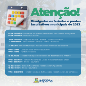 31/01/23 – A Prefeitura de Itapema divulgou nesta terça-feira (31/01) o calendário de feriados e pontos facultativos do município do ano de 2023, conforme o decreto Nº 05/2023.