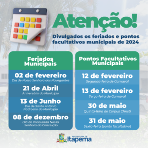 01/02/24 – A Prefeitura de Itapema divulgou nesta quinta-feira (01/02) o calendário de feriados e pontos facultativos do município do ano de 2024, conforme o decreto Nº 05/2024.