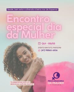 03/03/26 – A Procuradoria Especial da Mulher da Câmara de Vereadores de Itapema realiza, na quinta-feira (05/03), a partir das 8h30, um evento especial em comemoração ao Dia da Mulher, com atividades ao ar livre voltadas ao bem estar e saúde feminina. O encontro alusivo ao Dia da Mulher, acontece na orla da Praia Central, na Rua 157, é aberta ao público e gratuita.