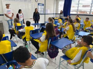 01/09/22 – O trabalho de combate ao mosquito Aedes aegypti conta agora com o Programa Educa Dengue. A iniciativa busca levar orientações aos estudantes da Rede Municipal de Ensino. Os quartos anos da Escola Joaquim Vicente de Oliveira, no Bairro Tabuleiro, foram um dos beneficiados, pois o tema também faz parte dos projetos desenvolvidos pela professora Cláudia Cristofolini de Jesus.