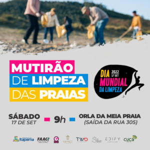 14/09/22 – Em alusão ao Dia Mundial da Limpeza, neste sábado (17/09) a Fundação Ambiental Área Costeira de Itapema (FAACI) realizará o Mutirão de Limpeza de Praias. A ação acontecerá na Orla da Meia Praia com saída às 9h da Rua 305.