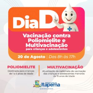 17/08/22 – A Secretaria de Saúde realiza neste sábado (20/08) o Dia D da Campanha Nacional de Vacinação contra a Poliomielite e Multivacinação. As Unidades Básicas de Saúde (UBS) estarão abertas das 8h às 17h para vacinação de crianças e adolescentes menores de 15 anos.